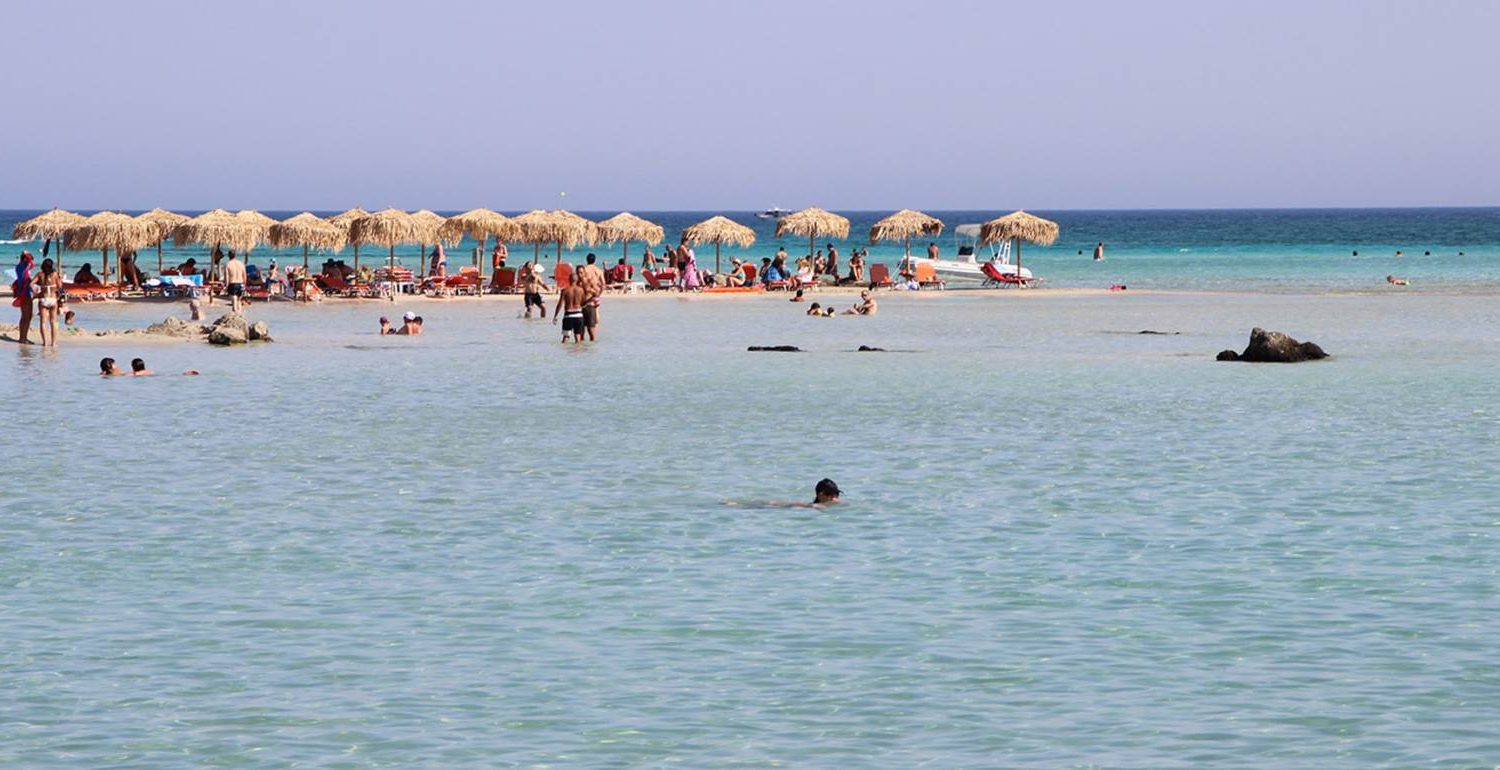 Αφού προσκυνήσουμε θα επιβιβαστούμε για τον επόμενο σταθμό μας, που δεν είναι άλλος από το εξωτικό Ελαφονήσι. Η μοναδική παραλία με την ψιλή ροζ άμμο από σπασμένα κογχύλια, την Καραϊβική της Κρήτης. Παραμονή για μπάνιο & ηλιοθεραπεία στα τυρκουάζ εξωτικά νερά. Η άμμος σε πολλά σημεία παίρνει ροζ χρωματισμούς από τα χιλιάδες σπασμένα κοχυλάκια. Στο σημείο που σπάει η χερσόνησος το νερό δεν ξεπερνάει το μισό μέτρο και δημιουργείται μια μικρή λιμνοθάλασσα με ζεστά νερά, ιδανική για παιδιά, εδώ φωλιάζουν και χελώνες Καρέτα-Καρέτα. Υπάρχουν καντίνες στην παραλία για ένα πρόχειρο snack. Αργά το μεσημέρι σε παραδοσιακή ταβέρνα σε χωριό της περιοχής θα έχουμε το μεσημεριανό μας, (έξοδα ατομικά) , και εν συνεχεία ξεκινάμε την επιστροφή μας, με μια πολύ σύντομη ενδιάμεση στάση, για το Ηράκλειο με τις καλύτερες εντυπώσεις από την εκδρομή μας.